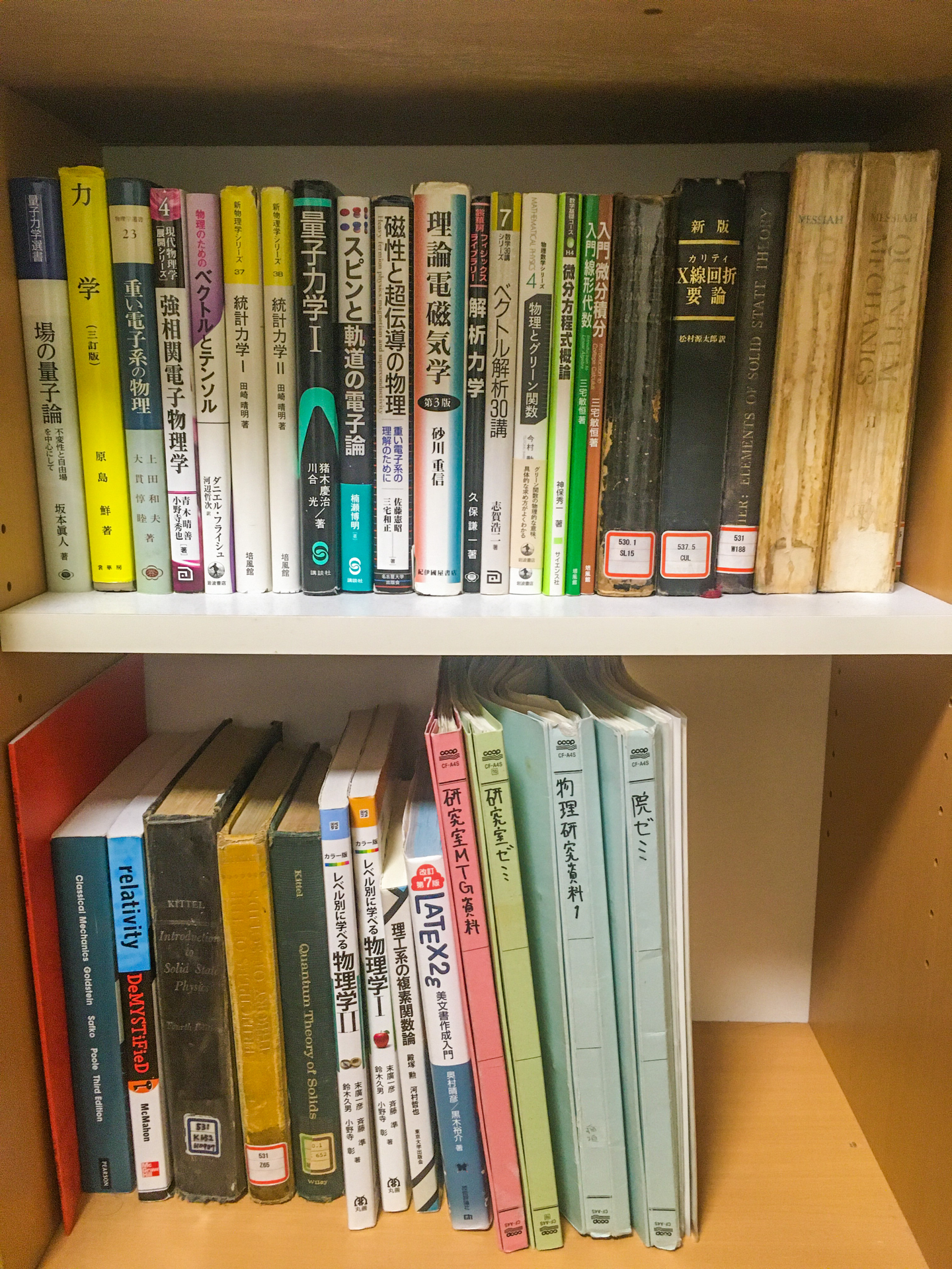 (家にある物理の専門書たち。中にはかなり年季の入った洋書もあります。)