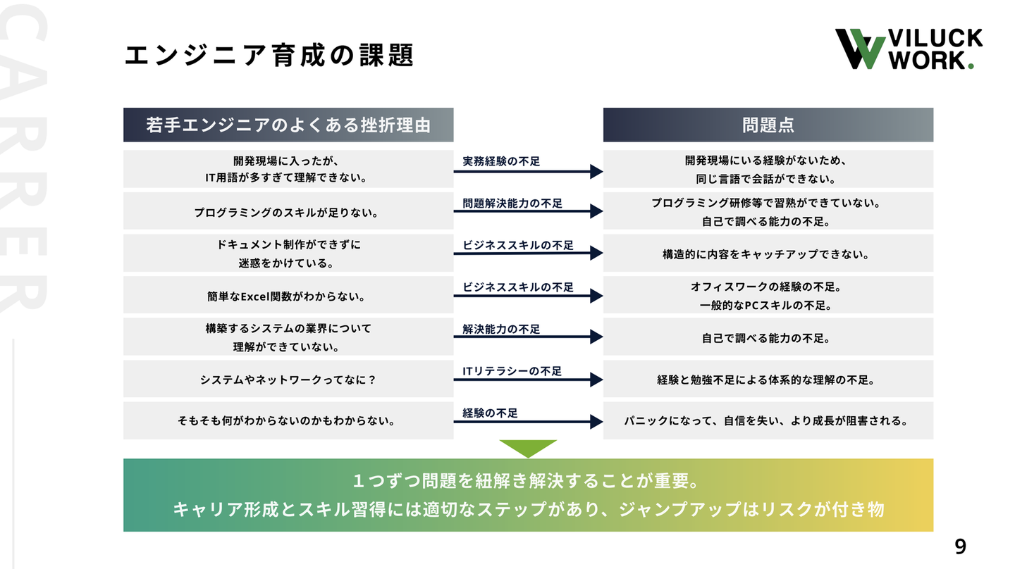 そのため、若手エンジニアにあった適切な研修を受けられず、エンジニアとしての成長が妨げられているからです。