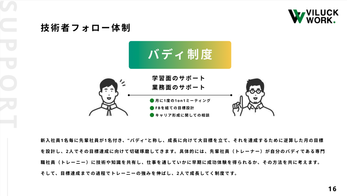 アサインされる若手エンジニアには研修を通じてスキルアップしてもらい、若手レベルから、中堅レベルまで能力を引き上げることでよりお客様からの評価をいただき、業務拡大を実現しております。
