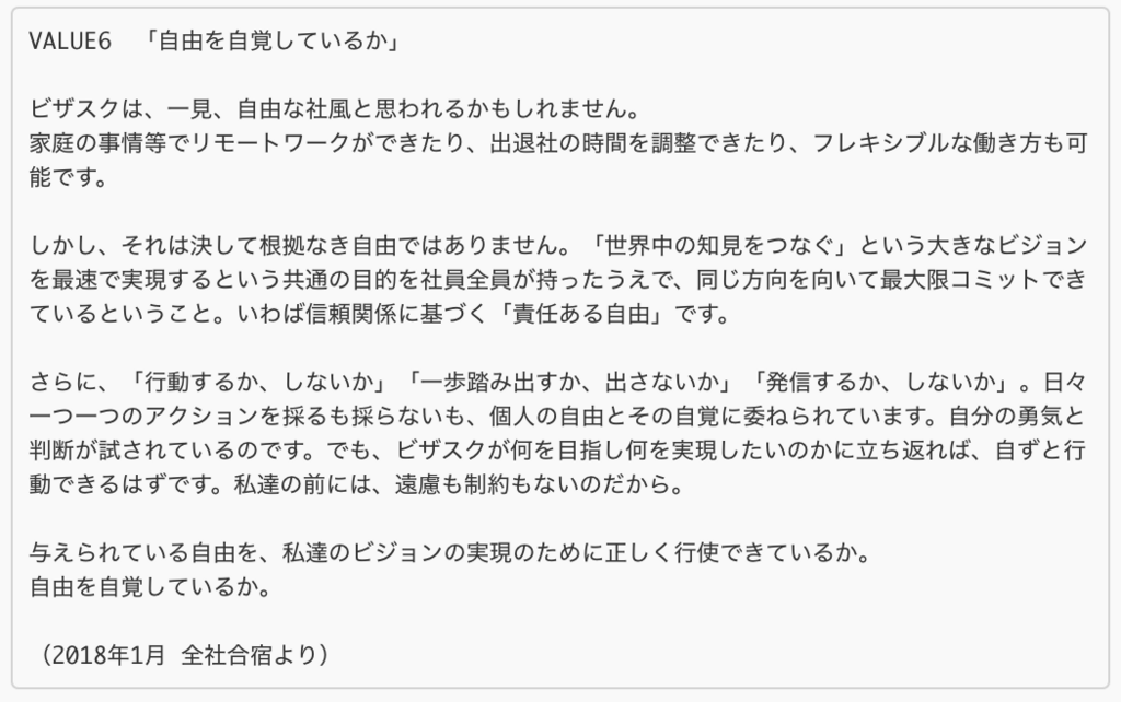 ビザスクのvalueには誰もが誤解しないようにフレーズの下に書き下し文があるのですが、今回も書き下し文があります。