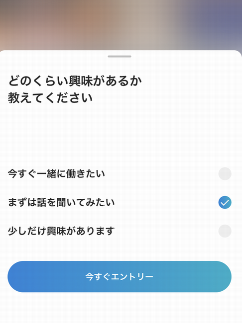 募集記事を見ると、「話を聞きに行きたい」という青いバーが下側に表示されています。