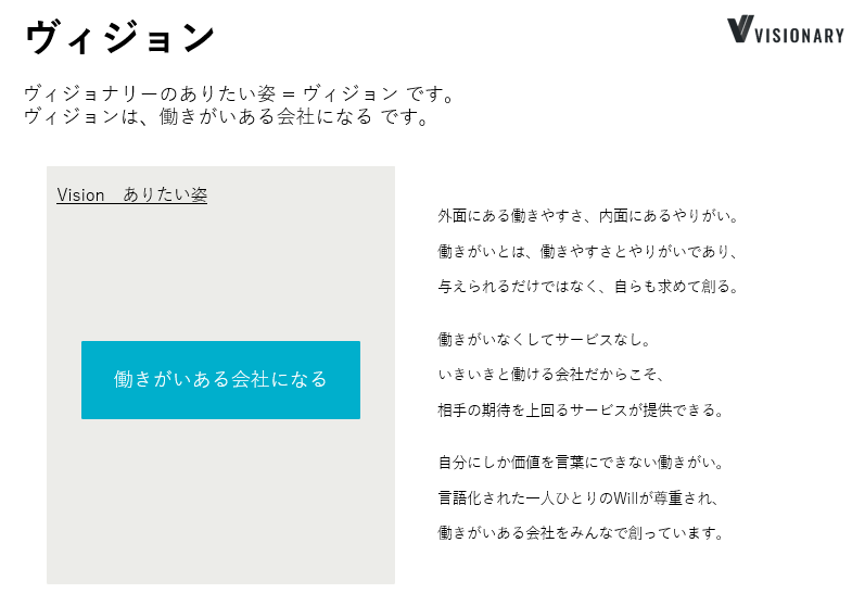 このヴィジョンにある「働きがい」とは、「働きやすさとやりがいであり、働きがいなくしてサービスなし、いきいきと働ける会社だからこそ、相手の期待を上回るサービスが提供できる」という意味があります。また、「社員一人ひとりのWillが尊重され、働きがいある会社をみんなで創っていく」という思いが込められています。