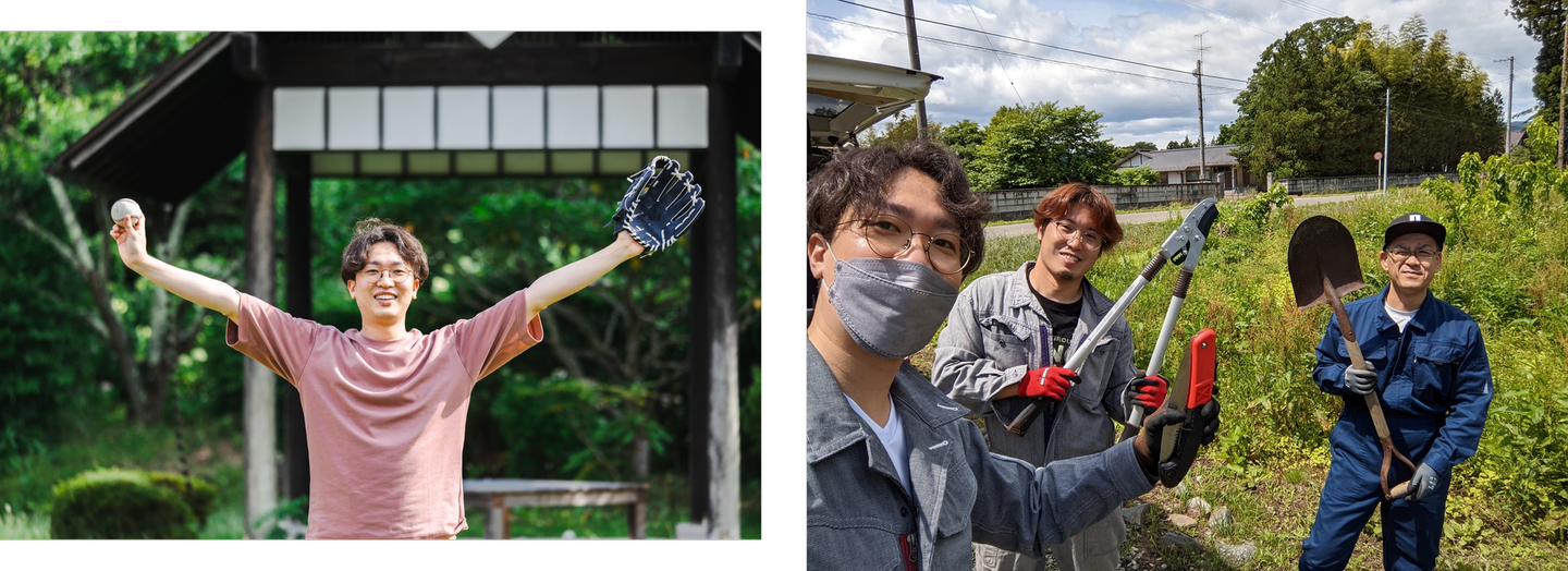 最近では、仕事以外でもメンバーとの交流の時間が増えて楽しいです。普段パソコン作業が多く、身体が固まって疲れやすいため、近くにいるメンバーと「ラジオ体操」をやってみたら、肩が軽くなって『これは良い!』と。それから、健康管理のためにちょっとだけ運動の時間を作って「食後のラジオ体操」「草刈り」、今では「キャッチボール」「バドミントン」もやっています(笑)