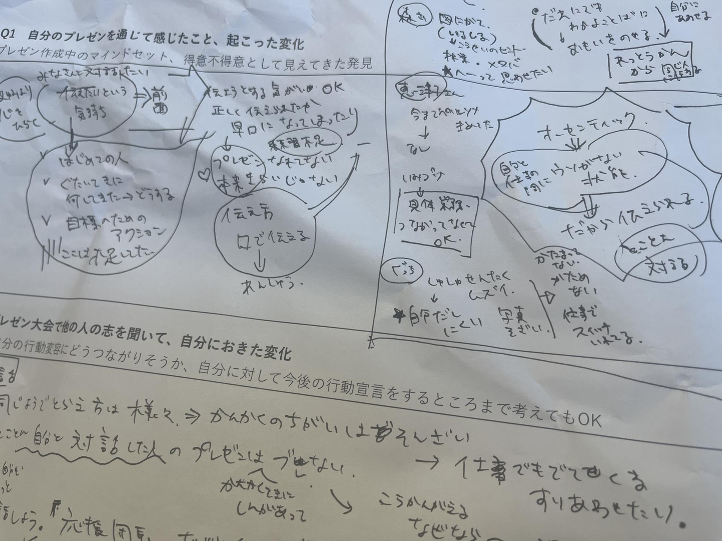 プレゼン大会後にワークショップを実施し、5名程度のグループになって「対話」を行う時間があったのですが、その時のルールが、相手のフィードバックをしたり、何か良いことを話そうと意識するのではなく、「輪の真ん中に言葉を置くイメージ」で話す、ということでした。