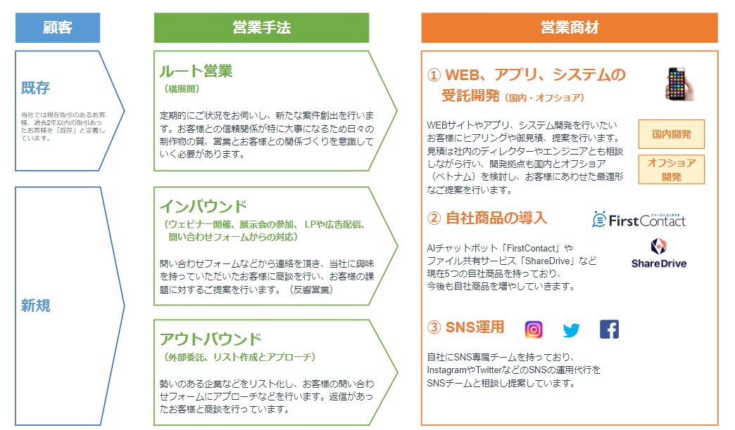 既存であれば基本はルート営業、新規であればインバウンドとアウトバウンドの営業となります!