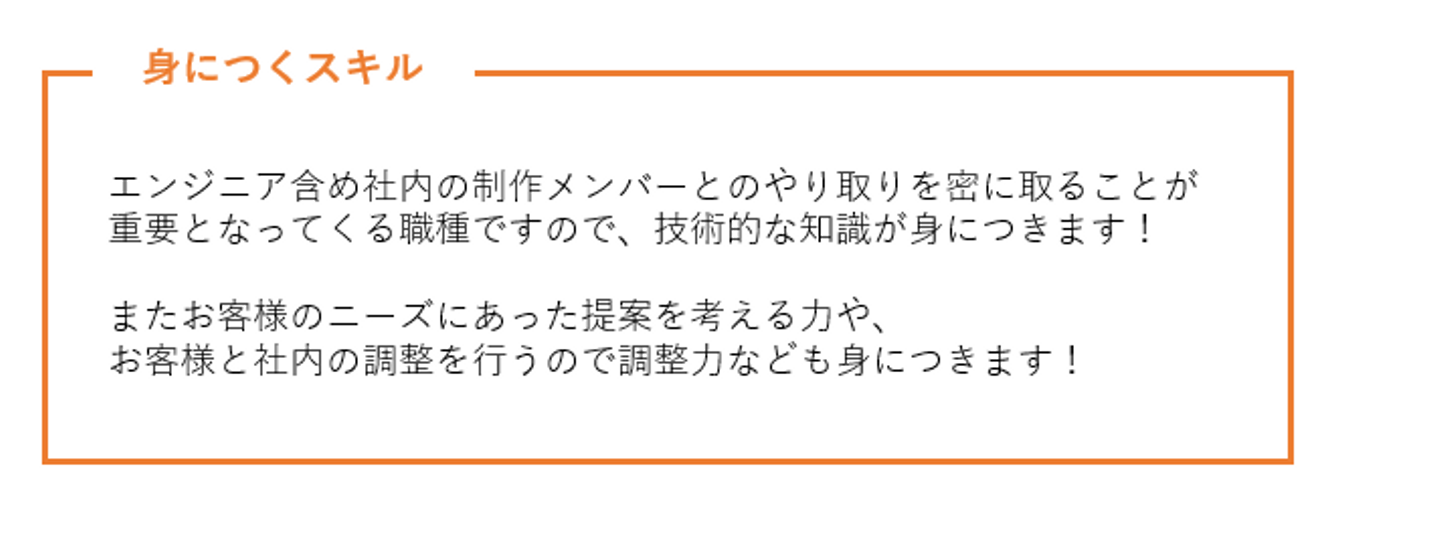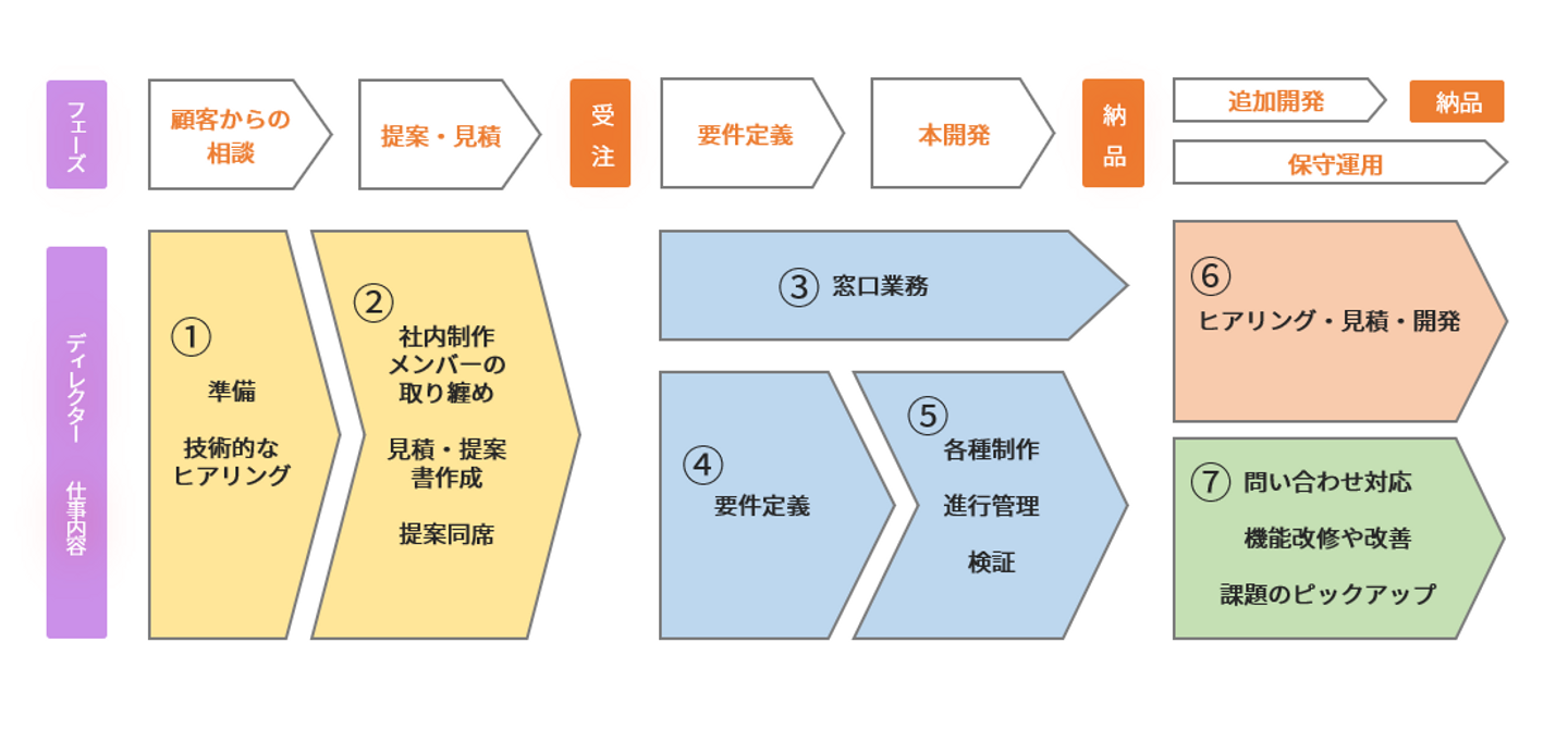 営業の提案に同席し、お客様に技術的内容の説明や提案、質疑応答を行います。経験を積み重ねると要点や勘所が分かるので、ディレクターとしてのスキルが現れます。