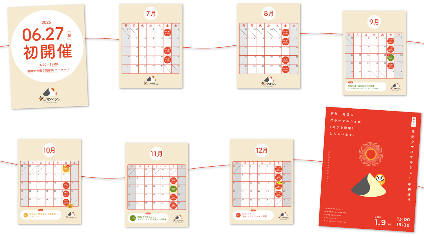 ”風街夕やけマルシェ” とは、平日の前橋まちなかの各商店街に賑わいを創出することを目的とした、街ぐるみのプロジェクトです。(”風街”という表現は、冬場に前橋市内に吹き荒れる北風、通称「からっかぜ」から名付けられました。)