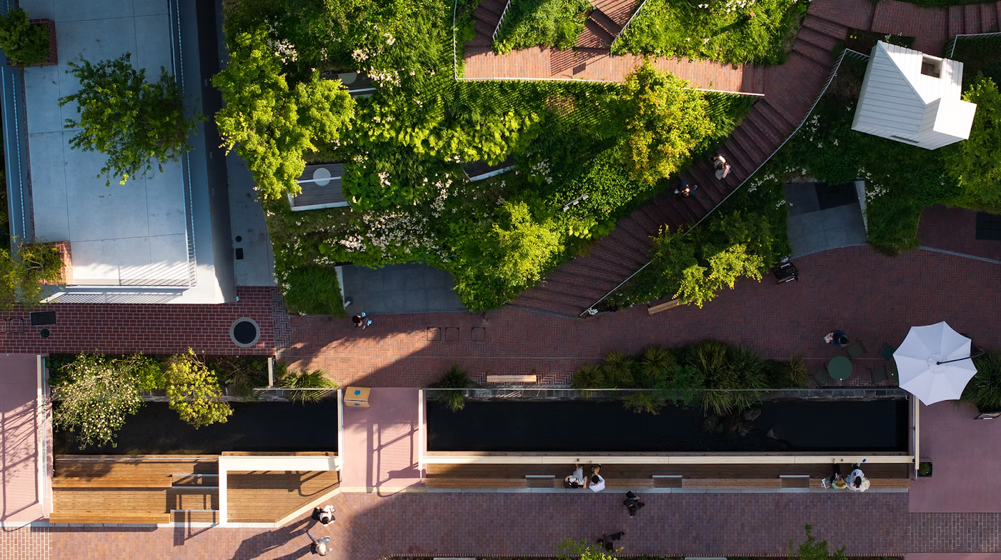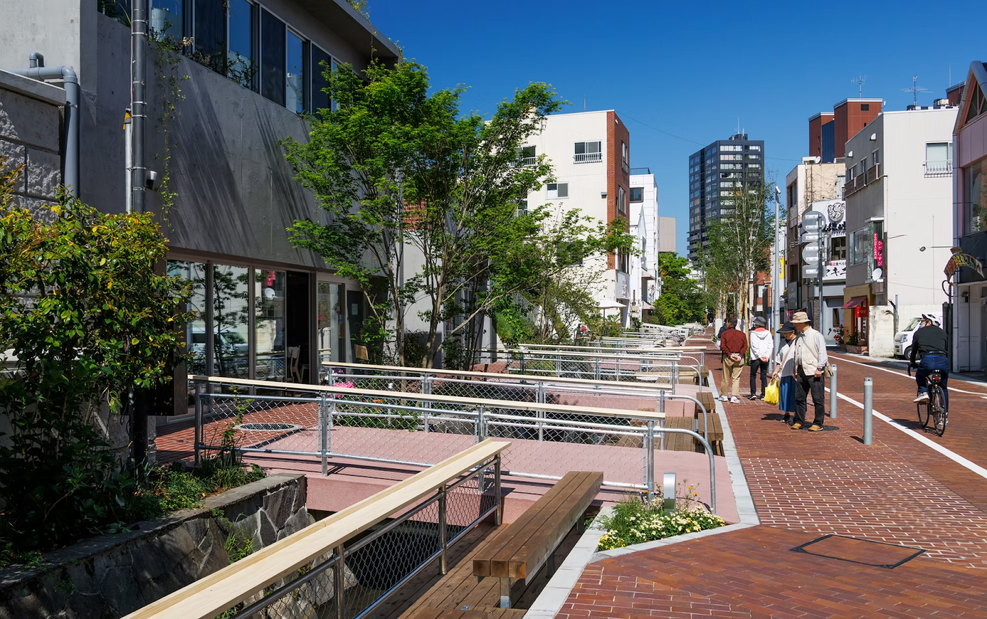 2021年から進められてきた “馬場川通りアーバンデザイン・プロジェクト” と呼ばれる全面工事が2024年に完了。レンガ敷のすてきな空間へと生まれ変わりました。川沿いには200メートルのデッキとベンチが設置され、水と緑に囲まれた中でリラックスできる場所になりました。私たちも、たまにベンチでお弁当を食べたり、ちょっとした話し合いをしたりしています。