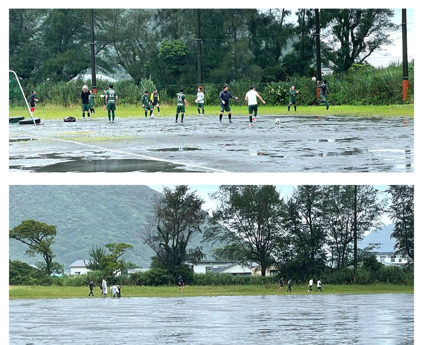 肝心のグラウンドは、ぐっちゃぐちゃ、コート内には複数の水たまり、これで本当にやるんですか!?と思っていると選手たちがウォーミングUPを開始!