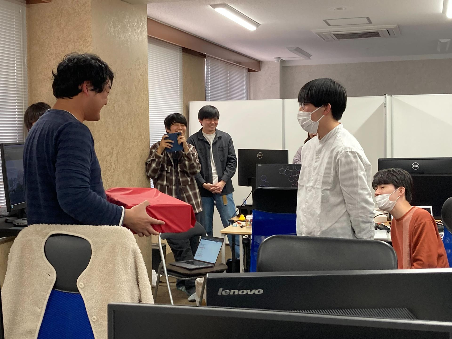 せっかくのチャンスということで、道畑から新入社員を代表して椎葉くんへプレゼントを渡してもらいました。