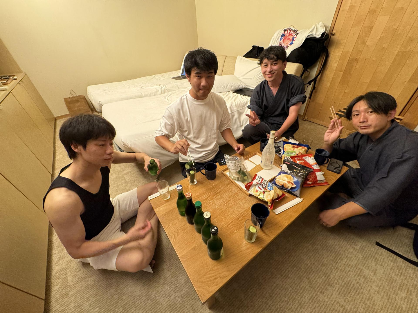 スイデンテラスに戻ってからは田んぼの見える温泉に入ったり、振返りをしつつ自分達の地域をどう活性化すれば良いのか、何が良かったのかなどを議論しました。(山形のお酒を飲みながら)