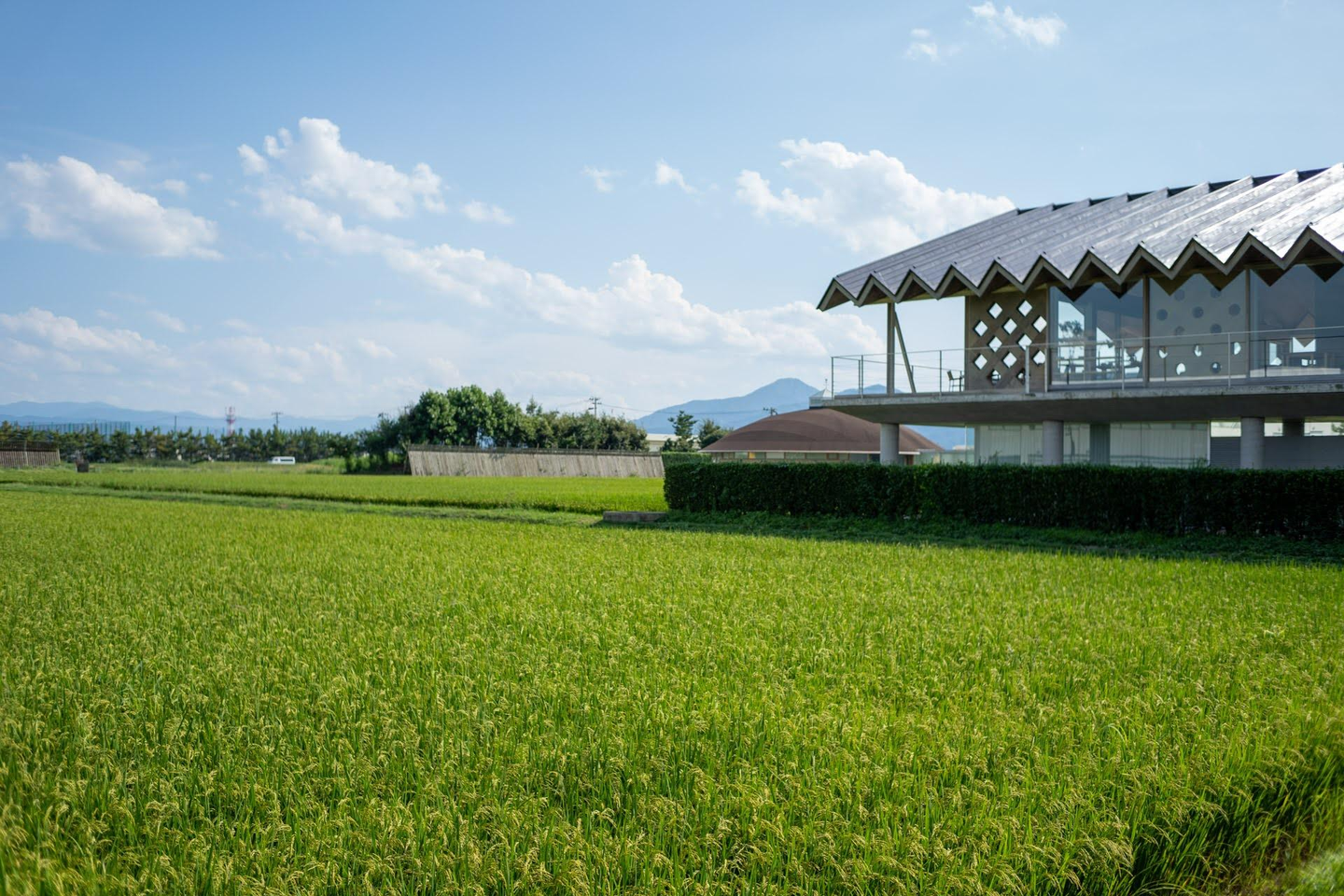 田んぼに浮かび、田園風景の一部として美しい佇まいを見せるスイデンテラス。