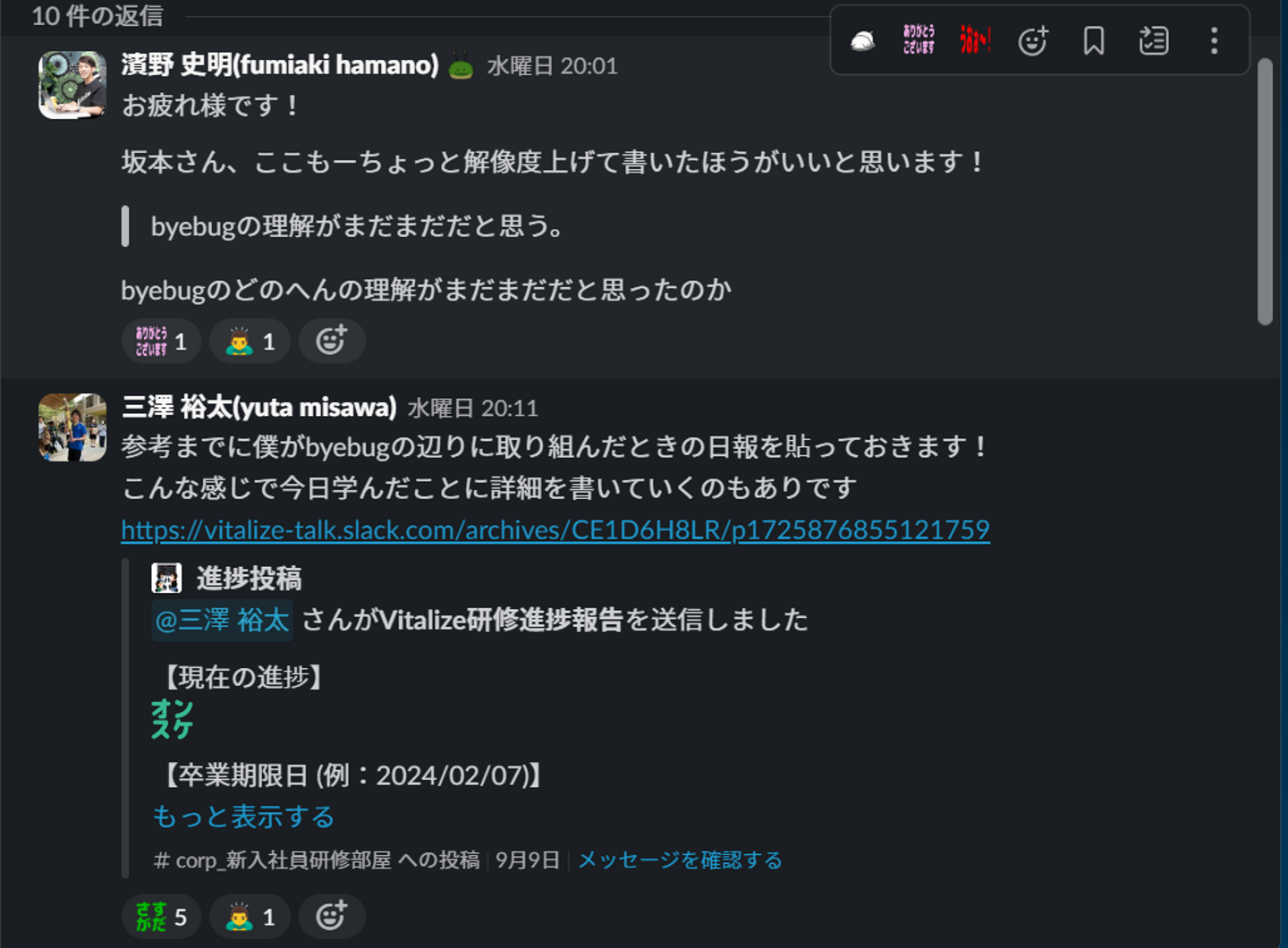 また、研修期間中には、退勤前にコミュニケーションツールと使用しているSlackの新入社員研修チャンネルにて、その日の研修内容や学んだこと、反省点等を報告します。