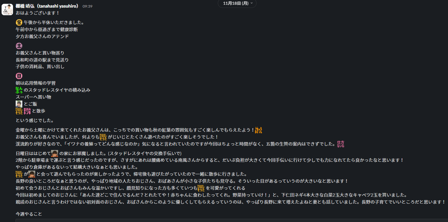 タスク進捗にて、自分の好きなことや、ハマっていること、日常の生活で感じたこと、自分の課題や困っていること等々自己開示することにより、メンバーもよりその人のことを深く知ることができます!