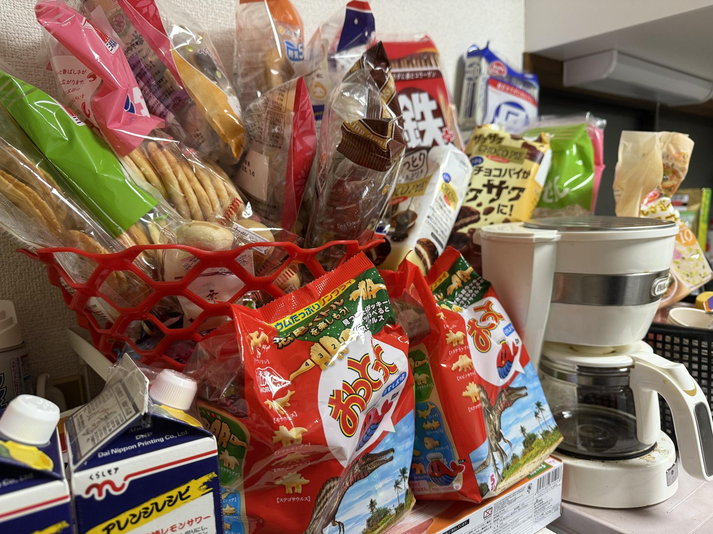 また、冷蔵庫の上にはお菓子コーナーがあり、自由に食べてOKです!