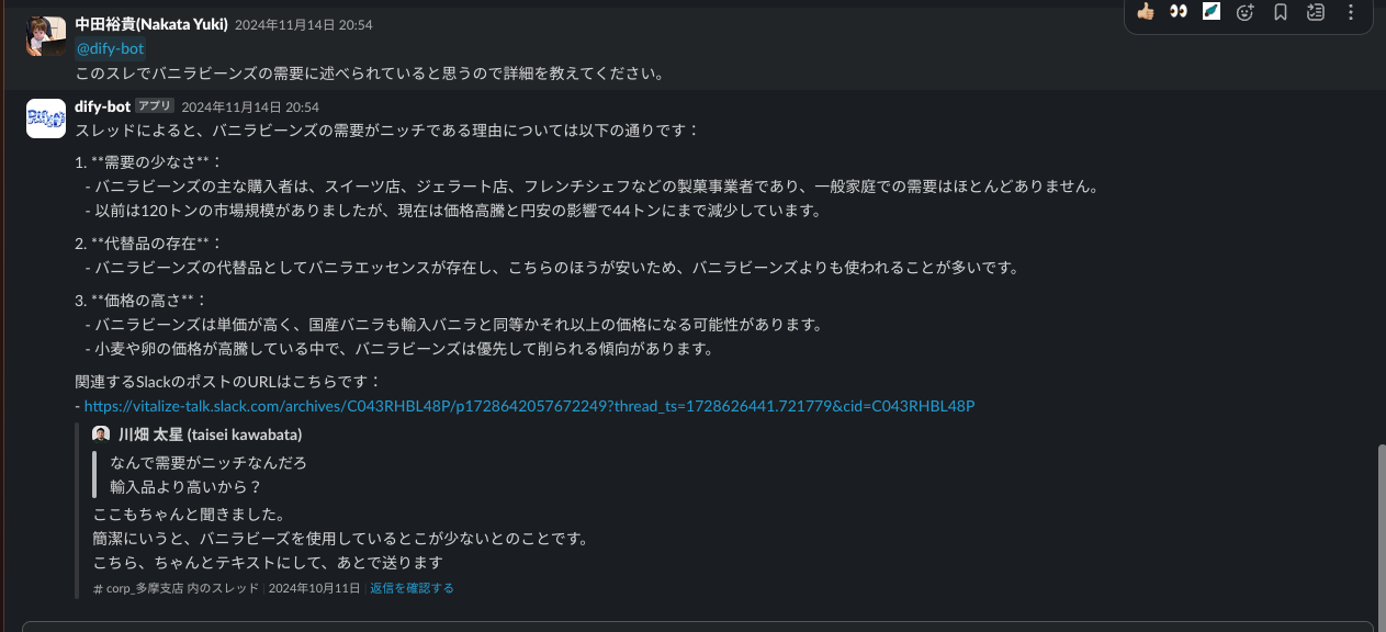 例えば、長いやり取りが続いたスレッドの内容を自動で要約したり、特定の話題について深掘りしてまとめてくれたりします。