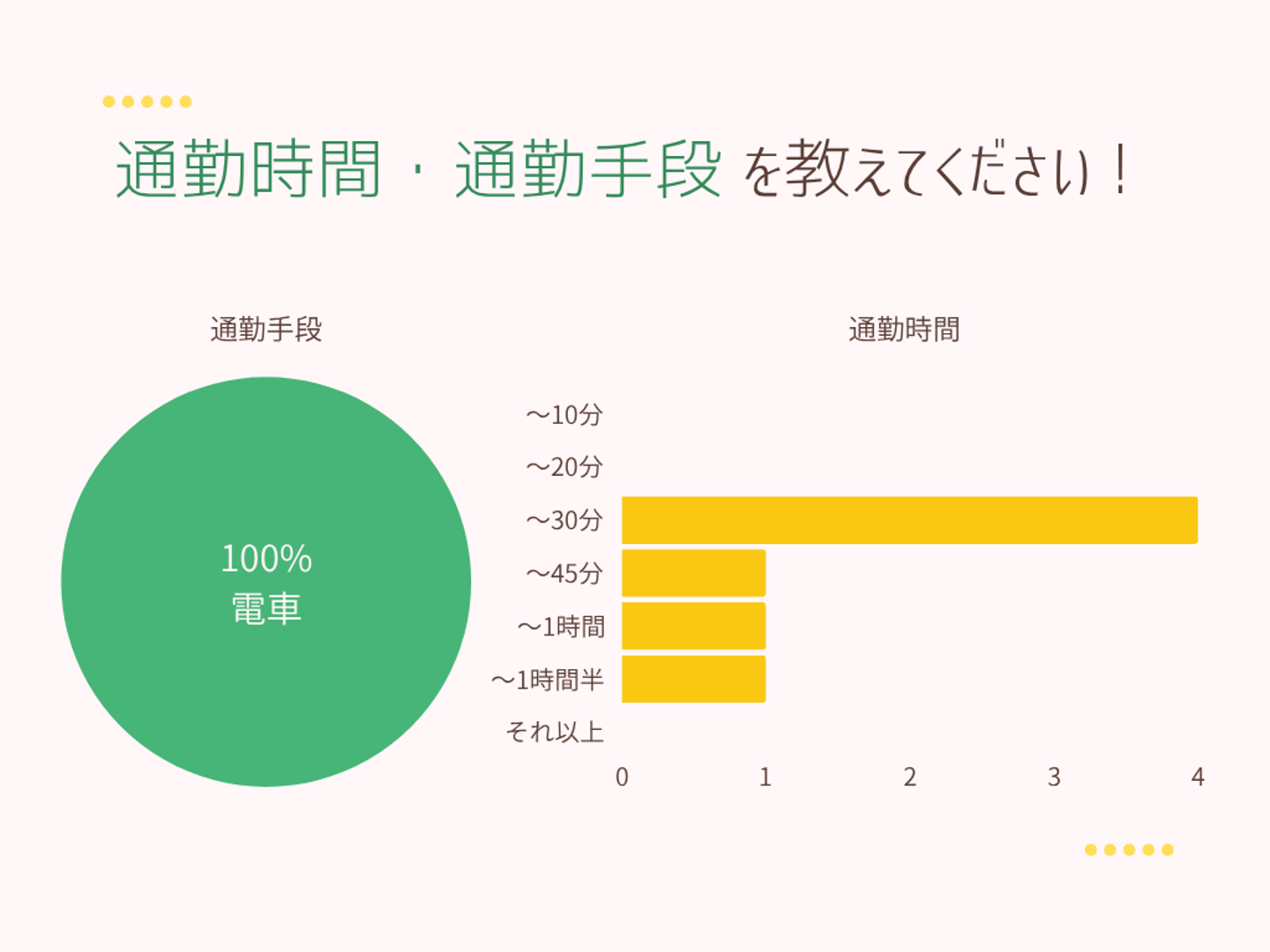 埼玉支店のメンバー全員が電車通勤で、うち半数以上が30分以内と回答。アクセスの良さが光ります。