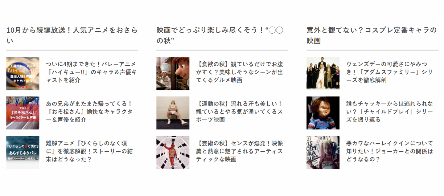 という2つの観点から作品を紹介しています。映画やアニメなどそれぞれのコンテンツに詳しい人材が集まっているからこそ出せる切り口ではないでしょうか。