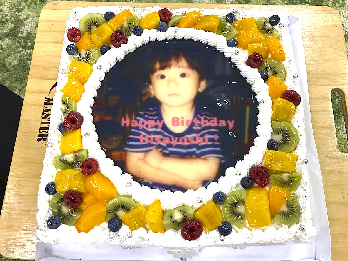 幼少期の写真がプリントされたバースデーケーキでお祝いです!目がくりくりでめちゃくちゃにかわいい...。