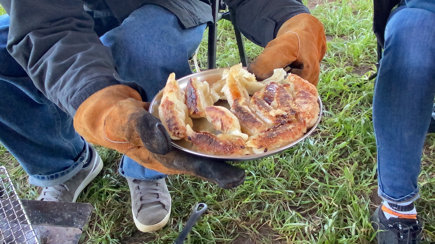 さて、昼ごはんのはじまり。やはり昼から外で飲むお酒は最高ですね。お酒とおいしいお肉でご飯がすすみます。強風で寒かったですが、焚火とブランケットでばっちり。