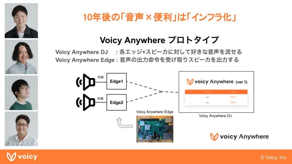 音声プラットフォームグロースの先で、Voicyが目指す音声のインフラ化。そんなVoicyの未来に向けてTeam Doraが製作したのは、どこからでも好きな音声を流すことのできる、その名もVoicy Anywhereのプロトタイプ(ロゴまで作ってます)。