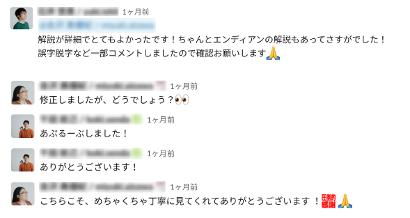 執筆が完了した初稿は、レビュー会でメンバー同士がお互いの原稿を読み合い、意見を交換しながらブラッシュアップを行います。