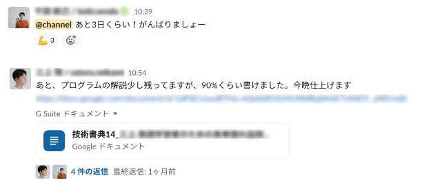 執筆は個人で行いますが、全員で向かうゴールは同じもの。Slackでも活発にコミュニケーションを取りつつ、チームで連携して技術書の制作にあたります。