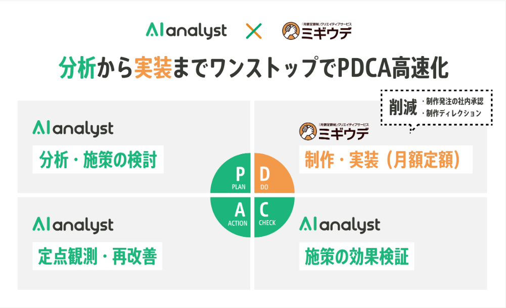 このワンストップサービス化の実現に向けて両社は、データ根拠が明示された集客施策や導線設計、施策管理、効果検証等のWebマーケティングのデータ分析と改善提案をAIが行う「AIアナリスト」と、月額定額制作クリエイティブサービス「ミギウデ」をシームレスに組み合わせます。
