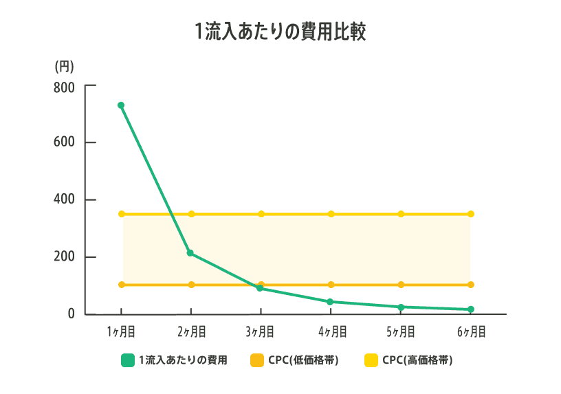 AIアナリストSEOのコンテンツが、広告に対してどれだけ効率的にリード獲得できているかを調査しました。その結果、2ヶ月目で検索連動広告の高額帯を下回りはじめ、3ヶ月で低額帯のコストも下回ったことが分かりました。