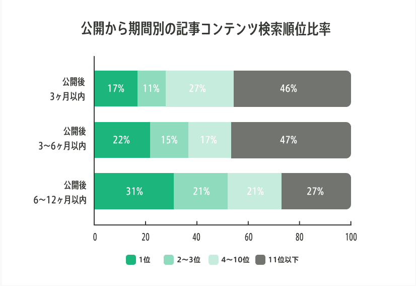 過去、当社が提供した記事は、公開3ヶ月以内のものでは1位が17%、検索結果の1ページ目におさまる10位以内が54%でした。また、公開後6-12ヶ月後のものでは、1位が31%(+14%pt)、10位以内が73%(+19%pt)まで増加しています。このように、弊社記事コンテンツのようにSEO対策の質の高いコンテンツは、時間の経過とともに集客力が高まっていくものと想定されます。