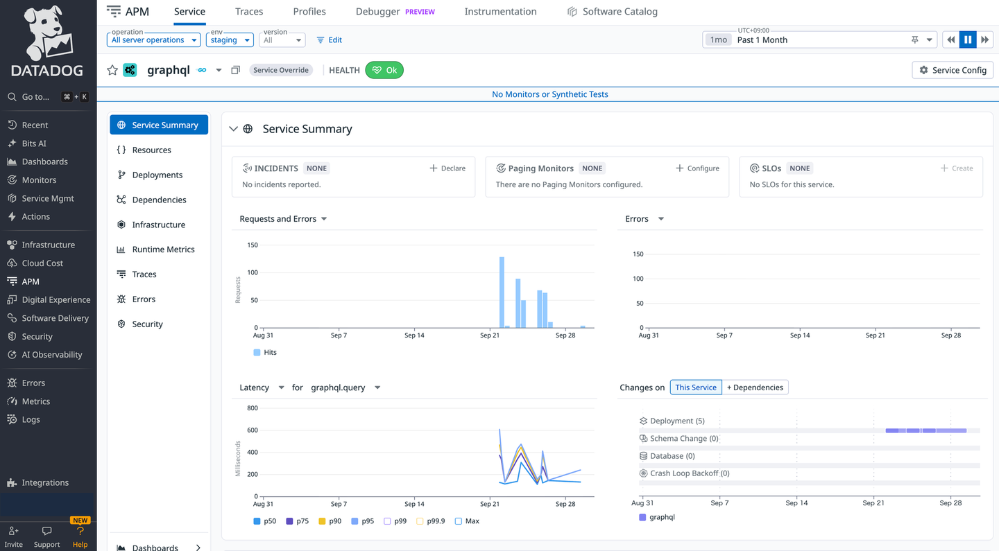 また、今回は Go の GraphQL サーバーを想定したため、トレーサーには github.com/DataDog/dd-trace-go/contrib/99designs/gqlgen/v2 パッケージを利用しています。