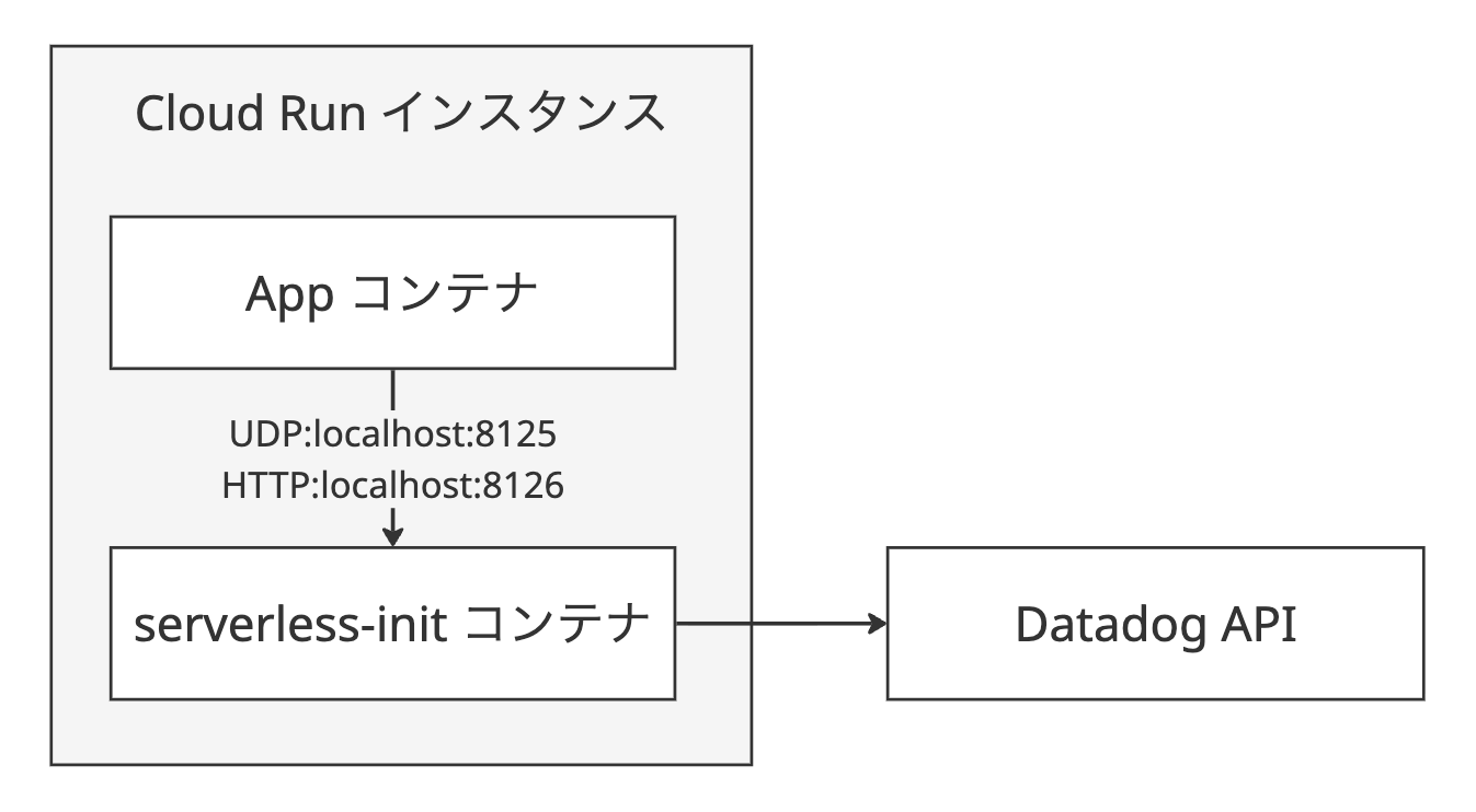 しかし Cloud Run はサーバーレス環境であり、シングルコンテナ = シングルプロセスの前提では長時間動作するプロセス (Agent) を常駐させることができません。そこで、今回は Datadog が提供する軽量 Agent である serverless-init を Cloud Run のサイドカーとして起動する方法を選択しました。