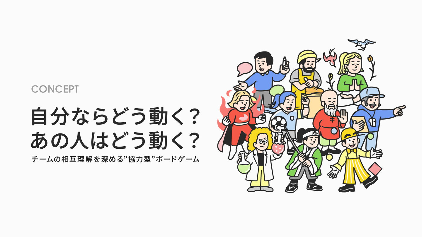 試行錯誤の末に生まれたコンセプトは、「自分ならどう動く?あの人はどう動く? チームの相互理解を深める協力型ボードゲーム」。
