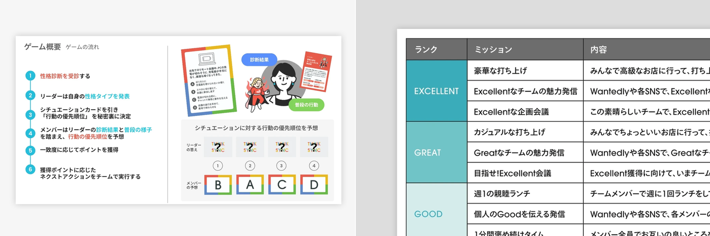 またゲームの結果に応じて、チームのエンゲージメントを高めるオフラインでの「ミッション」も設定。プレイ後も相互理解の時間が続くように、リアルな場面での体験設計にもこだわりました。