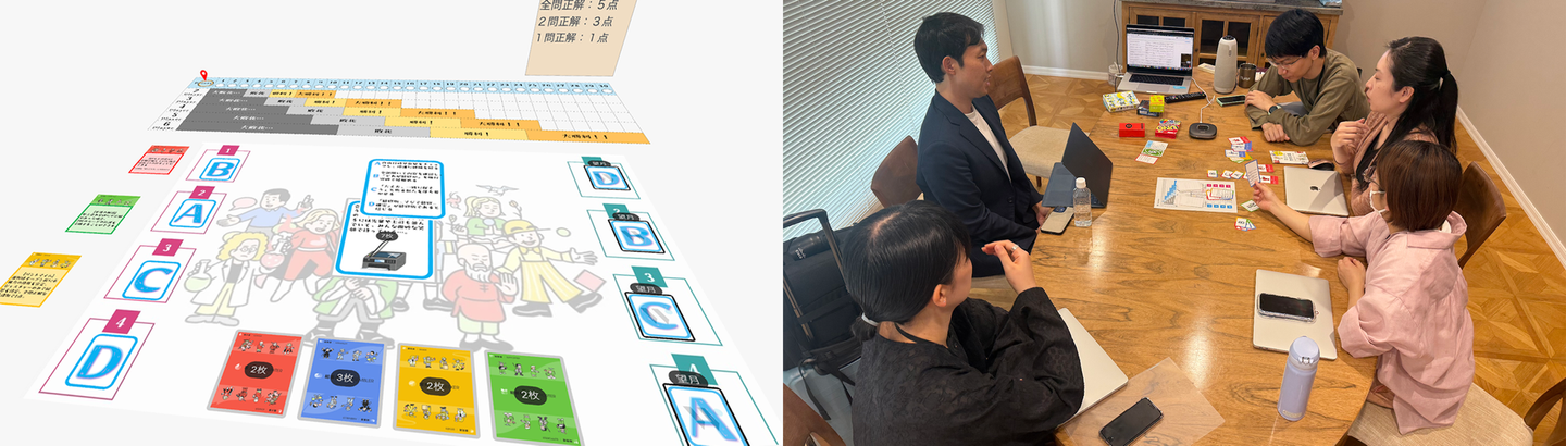 全体の構想が固まったあとは、プロトタイプを制作し、オンライン上でテストプレイを実施。加えて、簡易的なカードを作成し、ボードゲームが好きな社内メンバーに実際にプレイしてもらいました。得られたフィードバックをもとに、細部のルールやデザインを磨いていきました。