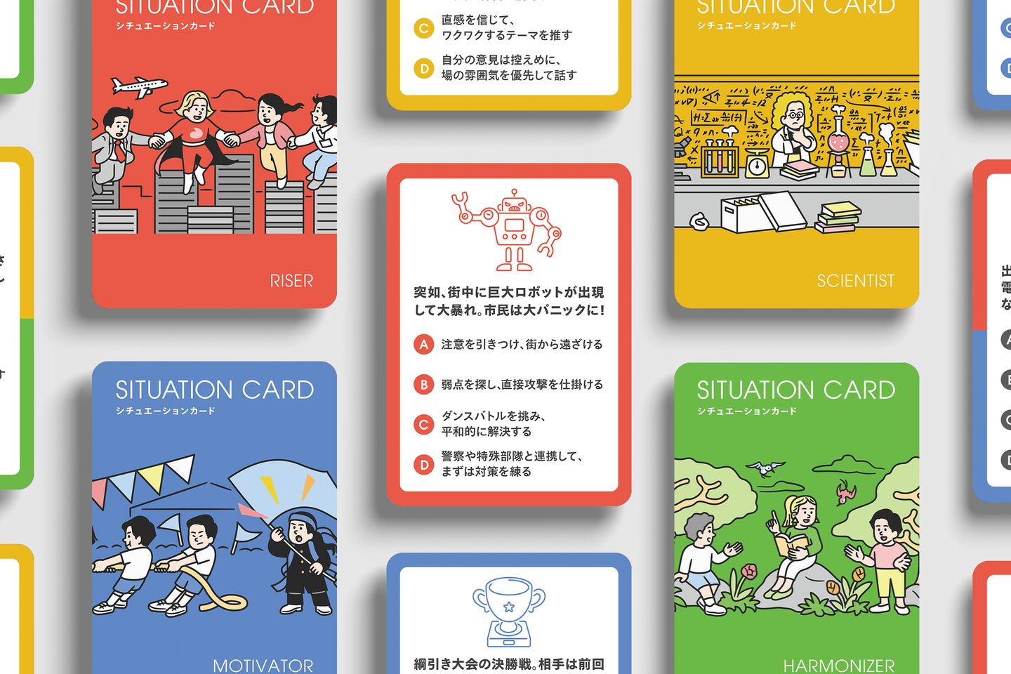 何度も楽しんでプレイしてもらいたい。その想いから、合計64パターンものシチュエーションカードを制作しました。普段の生活で起きそうな出来事を描いた「日常編」と、性格診断の世界観を踏まえた「キャラクター編」の2タイプがあり、それぞれの選択肢も一つひとつ言葉を磨き上げながら調整を重ね、完成へと近づけていきました。
