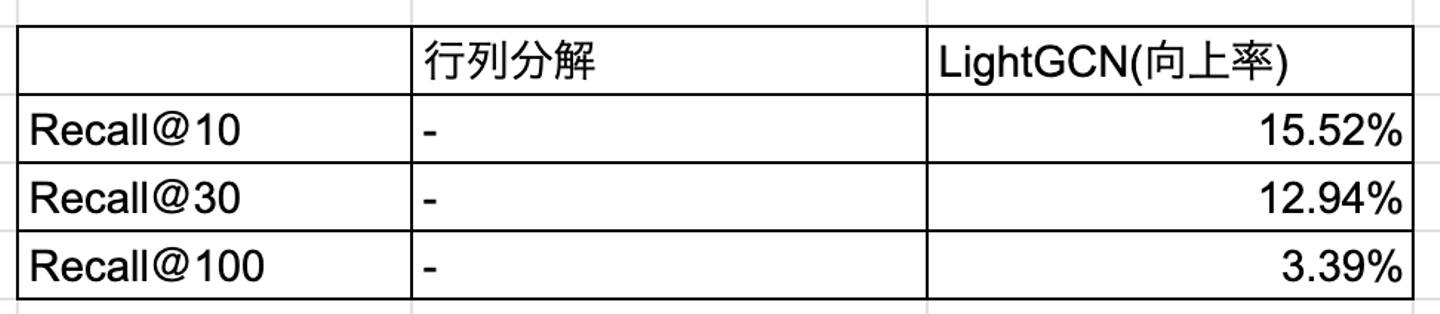 単純な行列分解と、特にパラメータ調整もしていないLightGCNでの比較なのでどちらも改善の余地は多々あるとは思いますが、今回の実装では既存の行列分解の手法より若干優れた候補集合が得られており、実データを用いた場合でも性能が向上する可能性があることがわかりました。