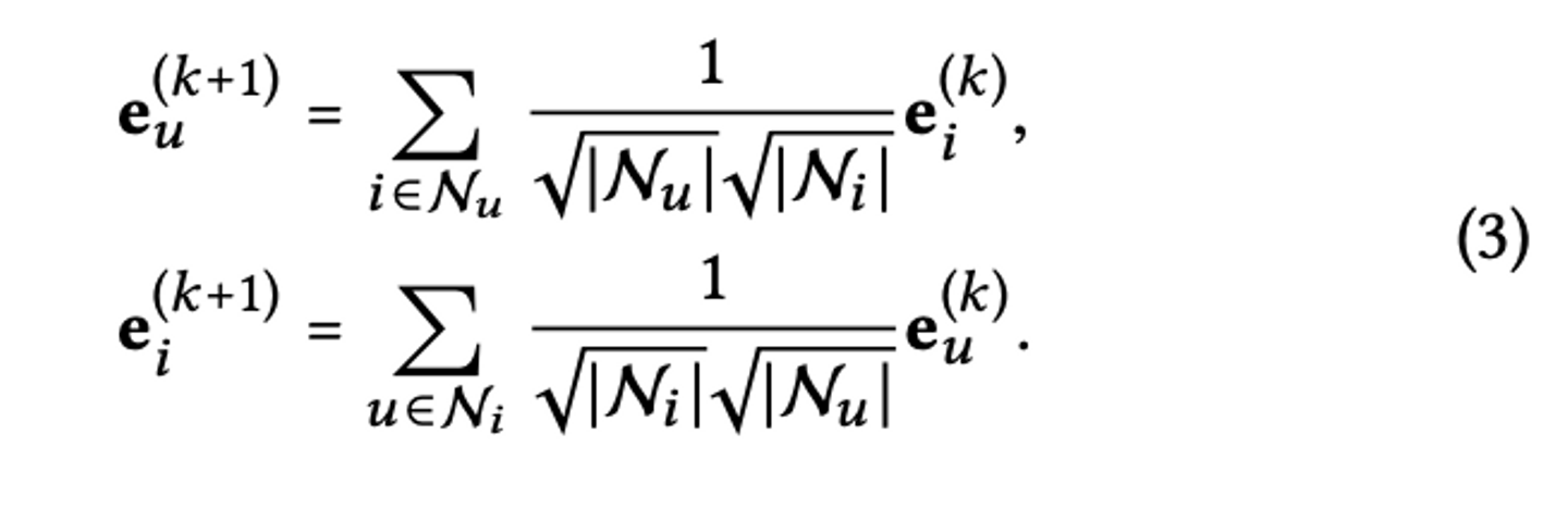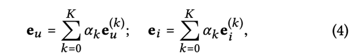 LightGCNでは着目するuserやitemに関して、隣接するnodeについて下記のようなLGC(Light Graph Convolution)を用いて埋め込みの伝播させています。(eは埋め込み、kは何次先のnodeを参照するか、Nは集合に含まれる要素の数を表します)