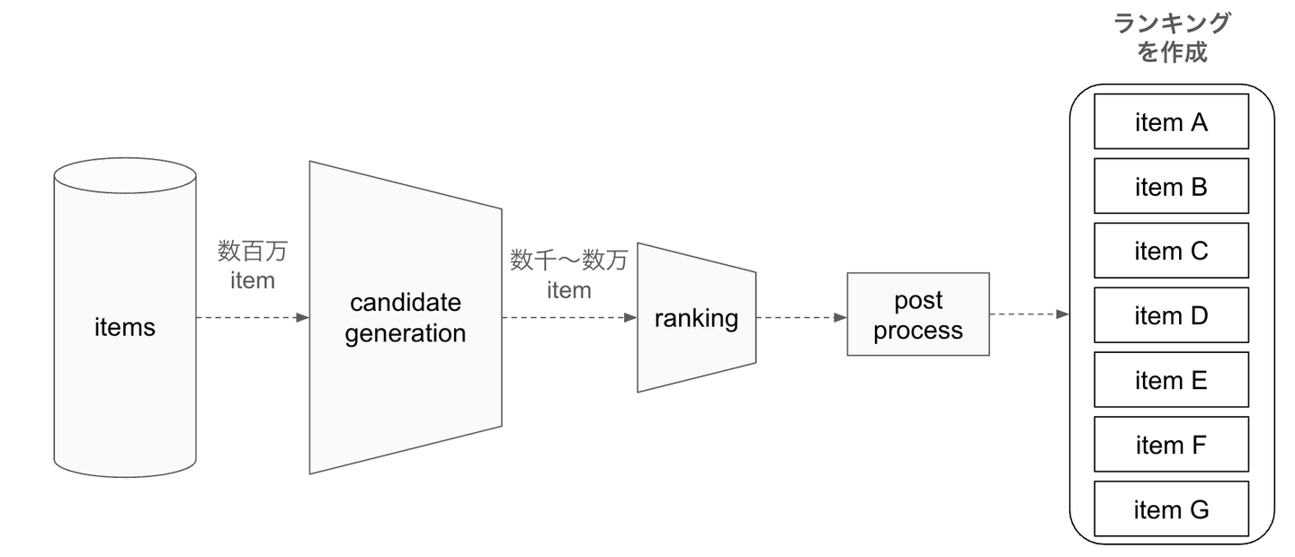最近の推薦アルゴリズムでは下図のように多段階にフィルタリングを行いながらスコアリング対象を絞っていく推薦の手法が一般的になっており、最終的なスコアリングを行う候補を絞る工程(下図で言うcandidate generation)が設けられていたりします。