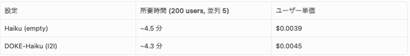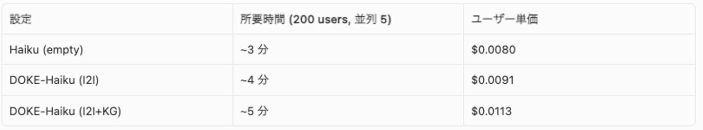 - コストは現実的: I2I+KG で $0.0113/ユーザー