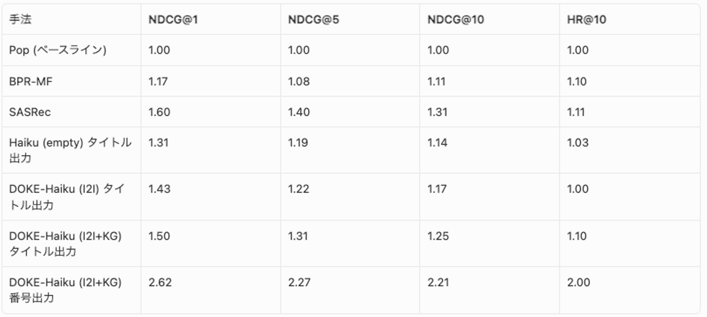 - SASRec が最高精度: NDCG@1 で Pop 比 +60% に対し、DOKE-Haiku (I2I+KG) タイトル出力は +50%。TF-IDF 評価のノイズを受けている可能性がある(後述)