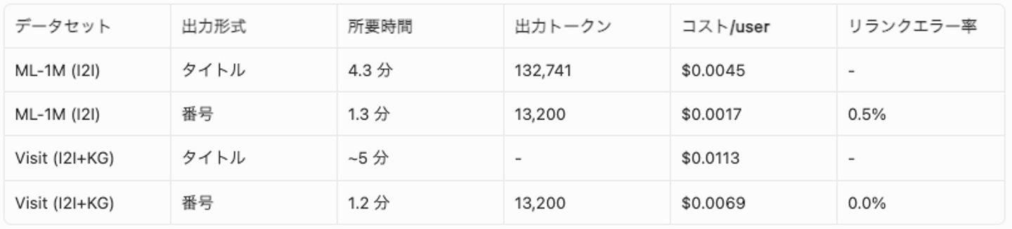 - リランクの安定化: JSON schema enforcement により出力形式は保証される。残る失敗は候補番号の範囲外や重複といった内容レベルのものだが、ML-1M・Wantedly データともに 0%。タイトル出力では LLM がタイトルを言い換え・省略するリスクがあり、名寄せ失敗の原因となる
