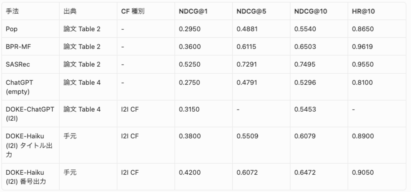 - DOKE-Haiku は DOKE-ChatGPT を上回る: 同じ I2I CF 条件で NDCG@1 は 0.385(本検証)に対し、論文では 0.315 で、Haiku 4.5 が gpt-3.5-turbo の結果を上回っている。モデルの精度向上を考慮すると自然な結果と考えられる