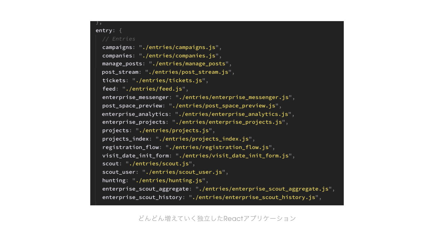 レールを敷いて生産性を上げる もう一つの課題として、開発生産性がありました。初めてReactを導入した時は、独立した特定のページで実験的に使いたかったので、丁寧な設計よりまずは動くものをとスピード重視で開発を進めました。しかし、そこから全体の設計を見直す間も無く、あっという間に色んなページで使われることになり、気づいたら19もの独立したReactアプリケーションが存在している状態になっていました。この画像は実際のwebpackのentriesのスクリーンショットです。