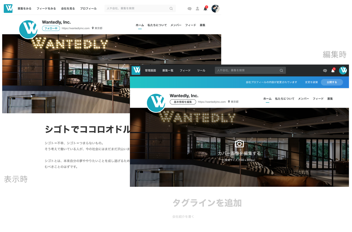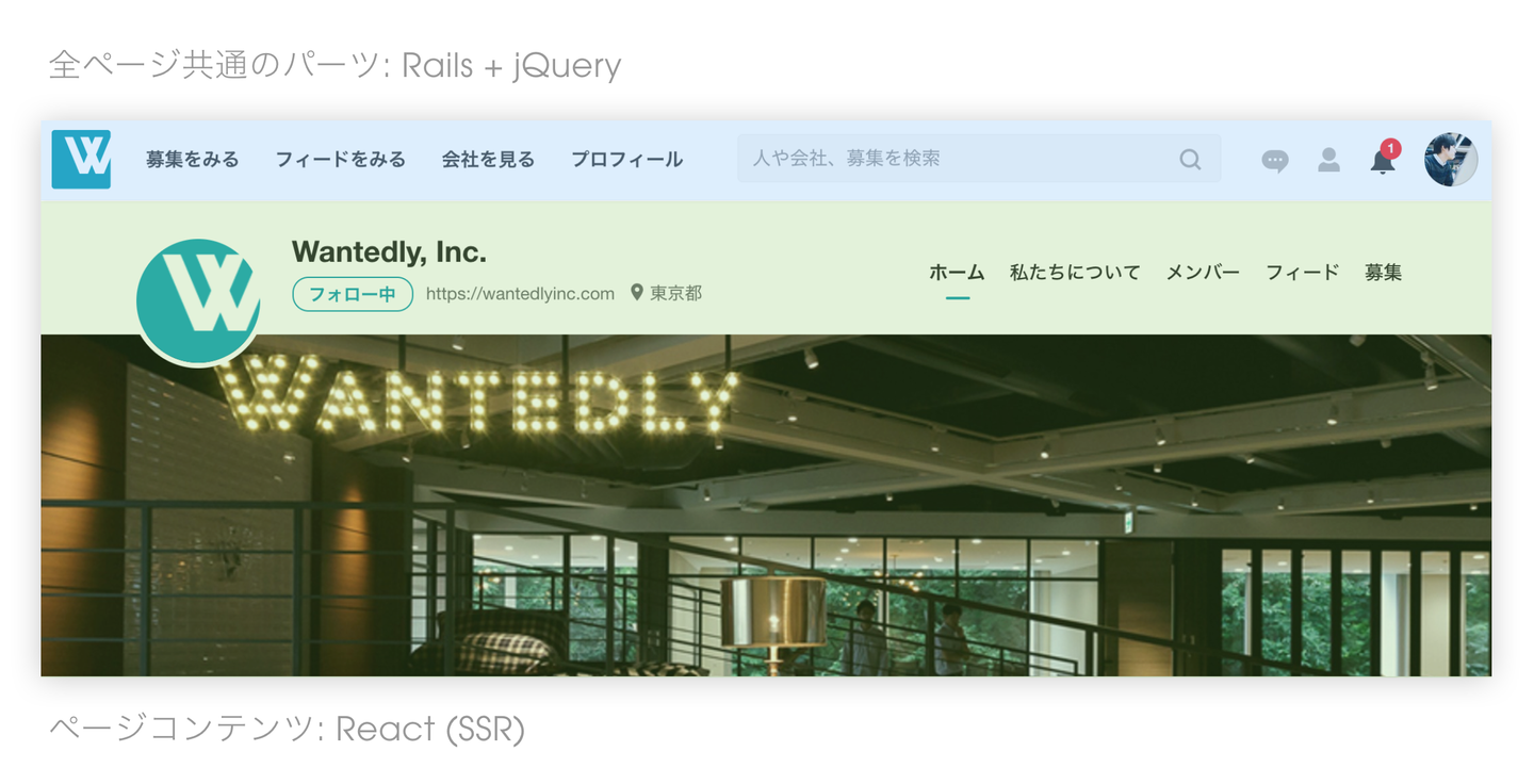 例えば、 Wantedly, Inc.の会社情報 を見るとシンプルなコンテンツを表示するだけのページに見えますが、会社の編集権限を持った人がアクセスすると、表示時の見た目のまま編集できる、いわゆるWYSIWYGな設計になっており、パッと見たよりもリッチな体験を提供できる実装が求められました。アーキテクチャを検討する際に、 もともとWantedlyでは2年以上前からReactを導入していたので、その選択を変えるつもりはありませんでしたが、既存のアーキテクチャでは対応できない課題がいくつかありました 。