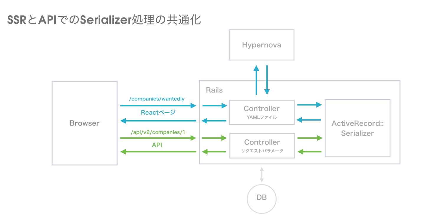 GET /api/v2/companies/1?fields=id,name,homepage,avatar.url&include=avatar 一般的なBFFサーバーでは、このようなリソース志向で凝集度の高いAPIを呼ぶことで、SSRに必要なデータを用意します。しかし、WantedlyのこのAPIは、Railsのコントローラーの実装は薄く、ほとんどのロジックはSerializerというリソース指向の JSON を生成するためのレイヤーに集まっていました。なので、そのSerializerを共通化することで、APIを叩かなくてもControllerの中でBFFと同じような役割を効率よく実装することができました。