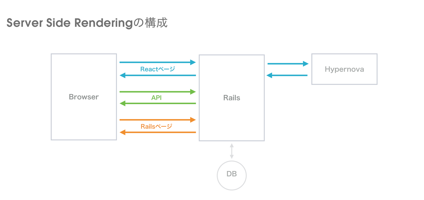 全てのリクエストは従来通りRailsで受けます。SSRが必要かどうかは、各Controllerでロジックをもち判断します。SSRが必要なら、controllerの中でモデルから必要なデータを用意し、そのデータをHypernovaに渡します。HypernovaはSSRした結果を返し、それをRails側で作られたレイアウトにはめ込み、ブラウザに返します。 これにより、全ページ共通のRailsで作られたレイアウトの中に、ReactでSSRする部分を共存させることができます。また、SSRするかどうかもactionの中で自由に切り替えられるので、SSRするか従来通りのRailsのビューを返すのかも簡単に出し分けることができます。