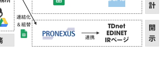決算短信や有報などの開示においては、MFクラウド会計から出力して、子会社と合算して連結決算にまとめ、シート上で組替を行ったものをプロネクサスさんのシステム上で開示資料に落とし込んでいます(ここは自動化していきたい…)。