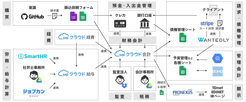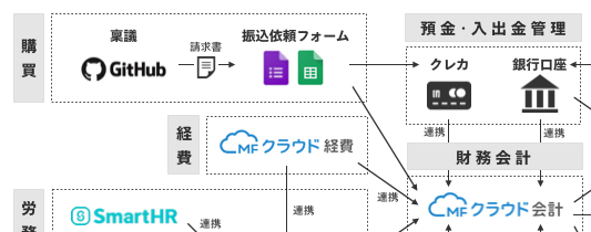 労務管理はもはやデファクトのSmartHR、勤怠管理はジョブカン勤怠管理を利用しています。それらとデータ連携(CSVインポート含む)して、MFクラウド給与で社労士さんに給与計算をしてもらい、そのデータを財務会計側にも連携しています。