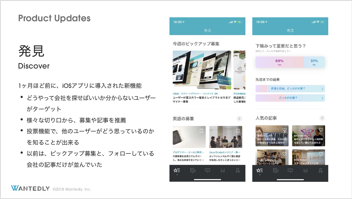 ちなみにDiscover Squadとは、Wantedly VisitのiOSアプリに最近実装された発見機能(社内ではDiscover機能と呼んでいる)を開発していたチームです。ユーザーが様々な切り口から募集や記事を探せるようになる機能で、A/Bテストを続けながら、2018年8月に全体リリースを行いました。